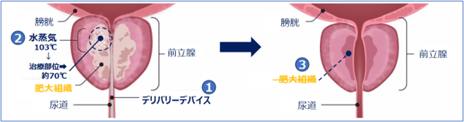 内視鏡を用いて尿道から入り(経尿道的)、水蒸気を利用して前立腺肥大症を治療する医療機器です。この経尿道的水蒸気治療は前立腺肥大症を低侵襲に治療する、新しい手術療法です。日本では行政の承認を2021年10月13日付けで取得しましたが、欧米では5年以上の実績があり、治療が安全に進められること、また治療の効果があることが、示されています。*術前検査の結果、本手術に適応されない場合もあります。